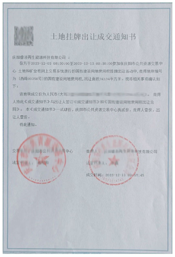 2023年12月13日,睿凌集团在庆阳市公共资源交易中心土地和矿业权网上交易系统挂牌拍得宗地编号为西峰00256号、面积51.2亩,用地性质为公用设施用地的国有建设用地使用权,拟将建设庆阳市西峰区餐厨(餐余)垃圾收运处置中心项目。